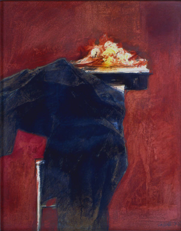 figura ammantata di nero, con largo copricapo, appoggiata aD una sedia; nulla si vede della sua persona; sfondo rosso
