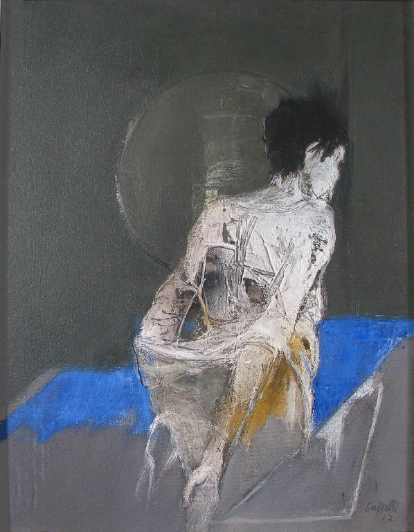 - NOTIZIE STORICO CRITICHE Il dipinto appartiene al periodo milanese di Cappelli, che ha inizio con il trasferimento dell'artista nella capitale lombarda nel 1959, dopo un decennio di attività trascorso a Roma. \nLa figura femminile sola, ritratta in un interno di cui si intravedono un letto sfatto o qualche altro oggetto dell'arredamento, è il soggetto privilegiato dell'artista. Una dimensione domestica in cui però interviene, come scrive Marcello Azzolini, "tutto un contesto relazionale con la realtà esasperata e nevrotica della condizione umana metropolitana e industriale" (in De Micheli 1974, p. 9).\nSi tratta di uno dei temi cari alla corrente del Realismo Esistenziale, cui l'artista emiliano si avvicina una volta giunto a Milano, soprattutto attraverso la frequentazione dei pittori Banchieri, Vaglieri e Ferroni.\nRispetto ai modi del Realismo Esistenziale, Mario De Micheli nota in Cappelli una più consapevole esigenza delle strutture formali e il mantenimento delle sue doti grafiche, che nei dipinti risultano accentuate dall'intervento del colore: "le doti di un disegno che s'indurisce e si fa amaro nella scarnificazione dei personaggi, definendone i caratteri con singolare efficacia" (De Micheli 1974, p. 8).