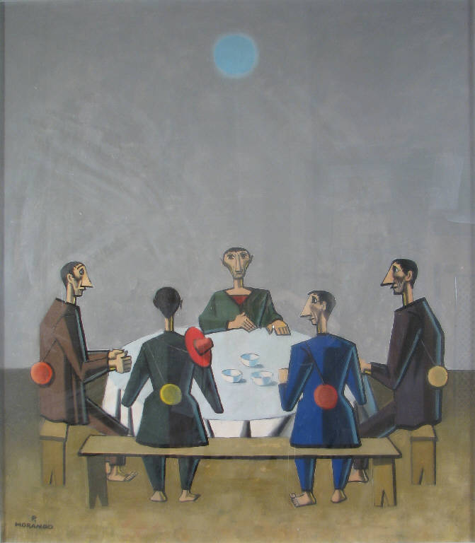 - NOTIZIE STORICO CRITICHE Rientrato ad Alessandria in seguito alla partecipazione alla Grande Guerra, dopo il successo ottenuto con i disegni eseguiti al fronte, Morando sceglie come soggetto della sua pittura la povera gente della sua terra: contadini, mendicanti, lavoratori in sciopero.\nCiò vale anche per questo dipinto della collezione Lajolo, che raffigura un tema più volte rappresentato dall'artista, quello dei viandanti radunati intorno alla tavola apparecchiata per un pasto frugale. Diversamente che nei dipinti realizzati tra gli anni '20 e '50 in cui lo stesso soggetto è raffigurato con i personaggi disposti in più file di tavoli rettangolari (Lajolo D. 1978, ff. 1, 27), in questo caso la collocazione delle figure intorno al tavolo circolare e soprattutto il risalto dato a quella posta al centro rendono più evidente il raffronto con il tema evangelico dell'Ultima cena e con le sue raffigurazioni pittoriche. La rivisitazione di soggetti dell'iconografia sacra in forma di episodi di vita popolare è del resto abbastanza frequente nella pittura dell'artista, come dimostrano i dipinti "La veglia", "Il viandante", "Naufrago" (Lajolo D. 1978, ff. 18, 36, 40).\nI viandanti sono rappresentati secondo la tipologia stilizzata che Morando adotta a partire all'incirca dagli anni '40, che trasforma le figure in personaggi magri e spigolosi, con accentuati nasi puntuti. Tipici dell'ultima fase di attività sono anche la stesura piatta e omogenea dei colori e il netto e spesso tratto nero che delinea oggetti e figure. Una scelta stilistica voluta dall'artista perchè ritenuta di facile lettura e quindi rispondente al suo desiderio di comunicare con il pubblico più semplice.