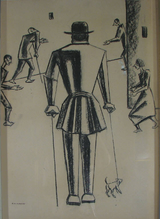 - NOTIZIE STORICO CRITICHE Rientrato ad Alessandria in seguito alla partecipazione alla Grande Guerra, dopo il successo ottenuto con i disegni eseguiti al fronte, Morando sceglie come soggetto della sua pittura la povera gente della sua terra: contadini, lavoratori in sciopero, viandanti e mendicanti.\nLa scena raffigurata in questo carboncino, in cui un ricco signore passeggia per la strada in mezzo a mendicanti che chiedono l'elemosina, mette in evidenza il divario esistente tra condizione di ricchezza e condizione di povertà.\nEsiste un olio su tela quasi identico al disegno della collezione Lajolo, se non per il diverso abito del ricco signore e per il fatto che non tutti i poveri passanti incontrati per strada tendono la mano per mendicare (Lajolo D. 1976, f. 40).\nUomini e donne sono rappresentati secondo la tipologia stilizzata che Morando adotta a partire all'incirca dagli anni '40, che trasforma le figure in personaggi magri e spigolosi, con accentuati nasi puntuti. Tipici dell'ultima fase di attività sono anche la stesura piatta e omogenea dei colori e il netto e spesso tratto nero che delinea oggetti e figure. Una scelta stilistica voluta dall'artista perchè ritenuta di facile lettura e quindi rispondente al suo desiderio di comunicare con il pubblico più semplice.