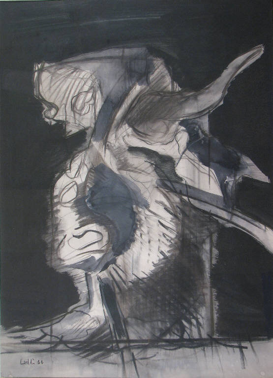 - NOTIZIE STORICO CRITICHE Il soggetto di questo dipinto, rappresentato secondo modalità assai vicine a quelle informali, è quello di una mucca, di cui si riescono a distinguere le corna, le nari e gli zoccoli.\nGli animali della terra contadina d'origine, buoi e mucche in primo luogo, compaiono spesso nei dipinti di Piero Leddi già a cominciare dagli anni '50, quando hanno ruolo di protagonisti nel suo immaginario pittorico (nel 1950, nella sua prima esposizione a Milano alla Facoltà di architettura, egli presenta disegni di bestie eseguiti al paese d'origine).\n"E' partito dalle mie parti, questo Piemonte così vario (...) - scrive Davide Lajolo - "I sogni delle sue mucche, i suoi incanti paesani, quadri che sanno di terra, d'aratri, di contadini, di gelsi, di pianura e di collina" (Lajolo D. 1972).\nLa tempera della collezione Lajolo appartiene ad una fase d'attività in cui Leddi ha già cominciato ad accostare a quelle del mondo agricolo, tematiche proprie del mondo urbano, non senza avvertire tensione tra le due realtà, nel disfacimento del mondo agricolo-artigianale, nell'esodo dalle campagne, nello sradicamento dell'uomo di campagna costretto in città (Loi F. 1974). \nLo stesso Leddi afferma: "ho voluto documentare la morte dei vecchi contadini e la mutazione degli attrezzi, della terra, dell'aria, degli uomini e animali (...). Io rinnovo il ricordo di uomini e animali che nei miei paesi avevano preso la forma fisica locale non riproducibile altrove" (Piero Leddi 1977, pag. 13).