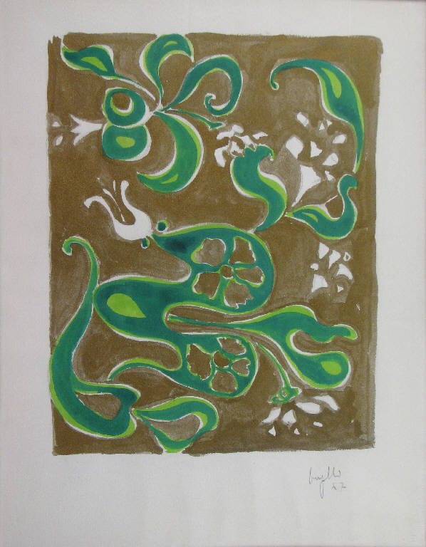 - NOTIZIE STORICO CRITICHE Il dipinto appartiene a quella fase di passaggio che conduce Aldo Bergolli all'ultimo periodo della sua attività.\nEsauritasi, a giudizio dell'artista, la serie delle "Metropolitane" (1959-1966), ormai divenuta per lui una maniera, Bergolli comincia a sperimentare nuove soluzioni pittoriche. Queste andranno a definirsi non prima del 1969 e l'anno dopo saranno presentate per la prima volta in una mostra personale alla Bottega d'Arte di Acqui Terme (Astrologo 2005).\nIl soggetto dell'ultimo ciclo pittorico è costituito da alberi e foglie; un mondo naturale raffigurato però secondo modalità antinaturalistiche e fantastiche, con elementi figurativi privi di spessore, forme ritagliate su uno sfondo omogeneo e luminoso (Tassi 1977).\nQueste caratteristiche si riscontrano anche in questo dipinto della collezione Lajolo, anche se nei lavori realizzati successivamente e più completi gli elementi naturalistici appaiono prevalentemente inseriti in un paesaggio, mentre in questo caso foglie e fiori risultano slegati da ogni contesto e stilizzati in un gioco d'astrazione che ne fa in sostanza dei motivi decorativi.