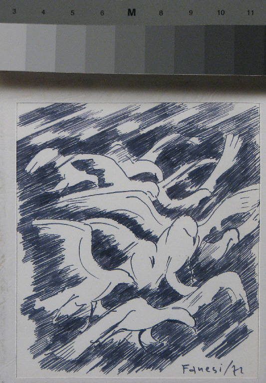 - NOTIZIE STORICO CRITICHE Quello dei gabbiani in volo è uno dei soggetti privilegiati dall'artista anconetano, accanto alla raffigurazione di paesaggi, marine e nudi femminili.\nCon più esattezza è a partire dal 1969, anno in cui Fanesi si trasferisce a Milano, che tali soggetti entrano in maniera prevalente nelle sue opere, dopo il superamento di un'iniziale fase "realista", l'attraversamento di un'esperienza astratta (1960-'61) ed una successiva ricerca sul movimento con temi quali ciclisti in corsa, lottatori di judo, voli dell'uomo nello spazio (Bellinelli 1973).\nProprio nella metropoli lombarda dunque esplodono, quando sono lontani dagli occhi, i paesaggi della terra marchigiana e in generale i temi legati alla natura.\nE' a questo primo periodo milanese che risale l'esecuzione del disegno in esame.\nIl disegno rivela la tecnica che l'artista mette a punto in questa fase: l'utilizzo di un fitto tratteggio diagonale che confonde i profi delle figure con lo spazio circostante, crea un'effetto di movimento e, come risulta visibile soprattutto nei lavori realizzati con i pastelli colorati, filtra e diffonde la luce sull'intera superficie raffigurata.