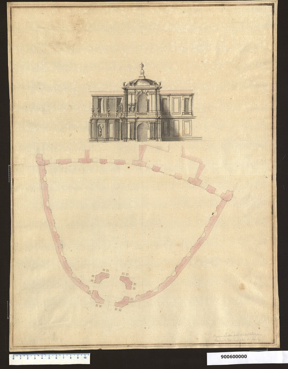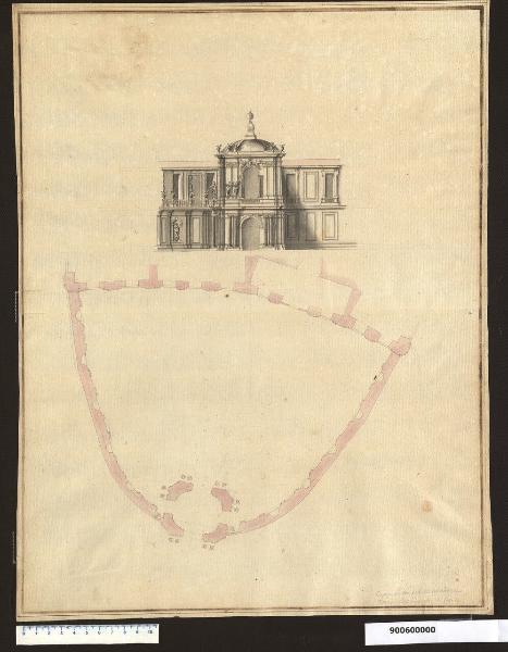 disegno eseguito con inchiostro nero su tracce della preliminare costruzione a grafite, con tiralinee e compasso, le murature in pianta e il tetto nel prospetto sono acquerellati colore rosa, gli sfondati e le ombreggiature nel prospetto colore grigio; è tracciato su carta chiara leggermente imbrunita. Il disegno presenta una doppia marginatura a inchiostro bruno a penna, di cui quella interna più spessa