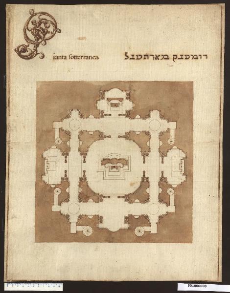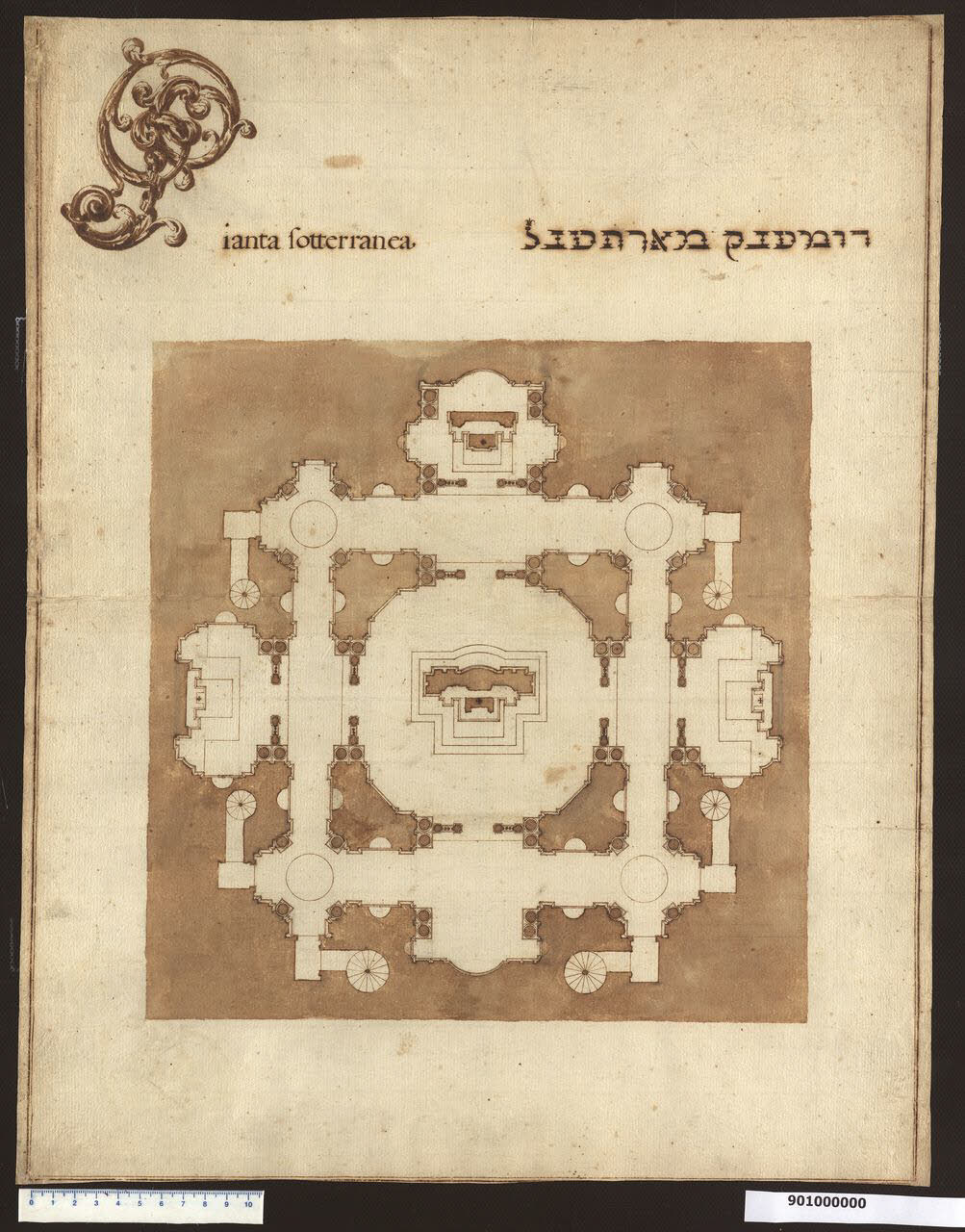 - NOTIZIE STORICO CRITICHE Il disegno rientra nel gruppo dei progetti, mai realizzati, che Martinelli elabora per il re di Polonia Jan III Sobiesky (1679-1696). Sono sconosciute le circostanze che portano Domenico Martinelli a progettare alcuni edifici per il re polacco, sono invece noti gli indirizzi della sua politica culturale e artistica, orientata principalmente verso Roma e all'ambiente dell'Accademia di S. Luca. Oltre a ciò, possono aver svolto un ruolo importante per i contatti con il Martinelli i rapporti personali del Sobiesky, che aveva come segretario personale Tommaso Talenti, proveniente da Lucca e, il fatto che il cardinale Francesco Bonvisi, lucchese, era l'inviato papale a Varsavia. Una data possibile per i progetti del Martinelli è quella del 1684, quando il re manda a Roma il suo confessore quale inviato artistico. Il presente disegno è tra quelli predisposti dal Martinelli per la chiesa monumentale, un progetto che prevede due fasi: la prima di studio della pianta e della facciata; la seconda alla soluzione definitiva della facciata, della cripta, della sezione longitudinale e della pianta del tamburo. Sul foglio in esame Martinelli traccia la pianta della cripta, che si sviluppa sotto e attorno ai quattro pilastri compositi del primo vano ottagonale della chiesa, del quale sostanzialmente riprende lo schema planimetrico: si tratta infatti di una croce greca con cupola all'incrocio dei bracci, e cappelle laterali corrispondenti a quelle superiori. Stretti corridoi cupolati agli angoli, mettono in comunicazione i vari ambienti della cripta. Il vano centrale coperta da una volta schiacciata ospita l'altare maggiore sopraelevato di alcuni gradini (cfr. Milano, Collezione Sardini Martinelli inv. 9,9).