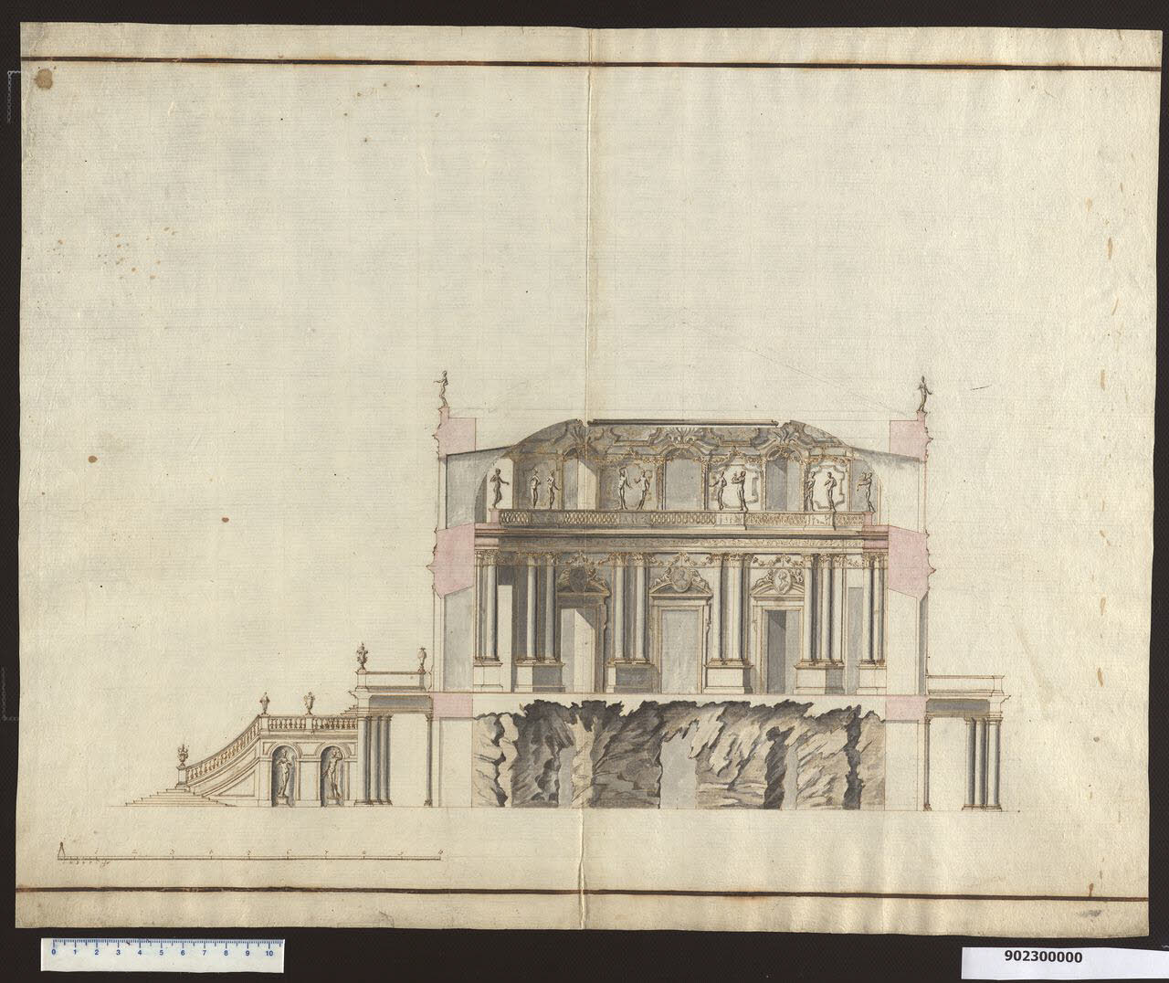 - NOTIZIE STORICO CRITICHE II disegno rappresenta la sezione della cosiddetta "Lustgebäude milanese", ossia villa da diporto che Johann Bernard Fischer von Erlach progettò per il principe Johann Adam Andreas Liechtenstein e che è così chiamata perché i suoi disegni furono rinvenuti all'interno del lascito di Martinelli conservato a Milano. Tra questi, oltre a un dettaglio centrale della facciata (Milano, Collezione Sardini Martinelli inv. 9,25), una scenografica vista prospettica (Milano, Milano, Collezione Sardini Martinelli inv. 9,33), alla cui scheda si rimanda per le informazioni relative al progetto generale.\nLa sezione mostra al piano terreno, al di là del porticato, un ambiente interno a "grotta", che corrode quasi il solaio del piano superiore su cui è impostata la sala centrale molto alta, coperta da una volta ribassata decorata da stucchi. Intorno alla sala, scandita da colonne binate unite da alti basamenti staccati dalle pareti, corre una balaustra sovrastata da statue che si affaccia sull'ambiente centrale. Le porte tra le colonne sono incorniciate e portano alla sommità timpani spezzati da medaglioni centrali, che sembrano appesi ai festoni di rami vegetali che si sviluppano da una campata all'altra sotto la cornice e sostenuti dai putti distesi sulla curvatura dei timpani stessi.\nAnche le aperture al piano della balaustra sono riccamente decorate e unite tra loro dai festoni vegetali.\nAl primo piano si accede dalla scalinata esterna, che presenta sul fianco due nicchie con statue ed è delimitata da una balaustra con vasi riproposta nel balcone sopra il porticato. Altre statue si elevano sul coronamento della copertura piana che include al suo interno la volta ribassata della sala interna.