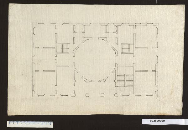 - NOTIZIE STORICO CRITICHE Il marchese Giacomo Sardini, erudito e dilettante di architettura, nella ricerca di idee per la ristrutturazione della propria villa aveva sollecitato disegni agli artefici con i quali era in contatto (vedi Milano, Collezione Sardini Martinelli, inv. 9,76; 9,31) ed anche curato in prima persona la stesura di alcune ipotesi. Il presente disegno, attribuibile a Sardini per confronto con altre sue tavole architettoniche, è apparentato con uno studio per prospetto (Milano, Collezione Sardini Martinelli inv. 9,28) che, tracciato su carta dello stesso tipo e con il medesimo inchiostro, tenta di risolvere un analogo problema: quello del raccordo di un salone centrale ottagonale entro un corpo di fabbrica quadrangolare. Il disegno in esame non è in scala ma il suo perimetro ricalca quello del progetto di ristrutturazione più antico, che si presume risalente allo zio di Sardini (Milano, Collezione Sardini Martinelli inv. 7,13; pubblicato in Sabatini, 1993, p. 63), pur senza tener conto delle aperture in esso delineate. Lo sviluppo rettangolare è tripartito in modo da inquadrare ed accentuare il salone centrale che si manifesta come semplificazione dell'idea suggerita dal capomastro Michelangelo Lippi per la villa di Pieve Santo Stefano (Milano, Collezione Sardini Martinelli, inv. 9,76); infatti, nel disegno di Sardini, le visuali verso l'esterno prediligono solo gli assi ortogonali. Intorno al salone centrale si dispongono, in simmetria, gli ambienti laterali e così pure i vani di servizio, tra loro raccordati, secondo uno schema codificato dal Cinquecento. I sistemi di risalita sono inglobati all'interno dell'edificio e così pure la scala a due rampe collocata in uno dei due vani rettangolari che affiancano il vestibolo d'ingresso.\nLa ristrutturazione definitiva seguì forme del tutto diverse da quelle delineate in questa tavola. La villa fu demolita intorno al 1930.