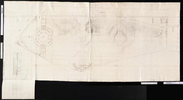 disegno in scala, conserva tracce della preliminare costruzione a grafite; è eseguito in parte a inchiostro bruno a penna e in parte a grafite, con tiralinee e compasso, con schizzi a mano libera a grafite; le murature di progetto sono acquerellate color rosa; il disegno è tracciato su carta chiara. Il supporto è composto da tre fogli incollati. L'orientamento corretto del foglio prevede la scala grafica in basso