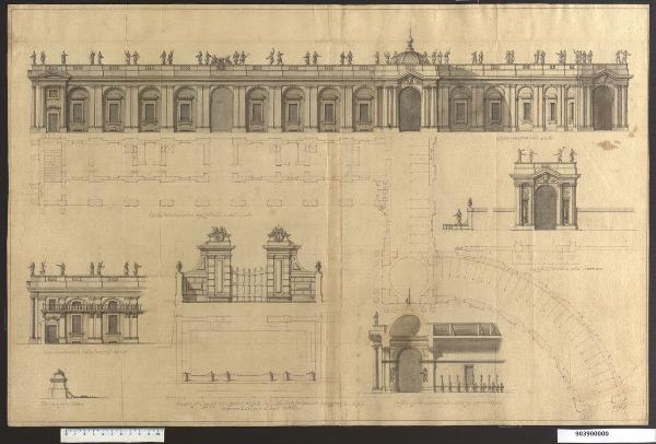 - NOTIZIE STORICO CRITICHE Questa tavola elegantemente composta e finemente rifinita in ogni sua parte, è probabilmente uno dei disegni di presentazione del progetto, che illustra gli edifici delle scuderie a nord del castello, con dettagli di alcuni elementi architettonici significativi.\nIl complesso delle scuderie, come si evince dalla planimetria generale (Milano, Collezione Sardini Martinelli inv. 2,40), si sviluppa simmetricamente secondo l'asse nord-sud, in due ali perpendicolari al fronte nord del castello, con gli alloggi degli ufficiali al servizio del conte Kaunitz e due corpi paralleli allo stesso fronte, che si allargano formando un'esedra aperta centrata sulla linea dell'ingresso, contenenti le stalle.\nNel disegno sono rappresentati in pianta metà esedra e il tratto rettilineo delle stalle, fino all'innesto col corpo degli alloggi; di queste parti è sviluppato il fronte interno completo verso il castello e un tratto del fronte opposto dell'edificio per gli ufficiali.\nNell'edificio delle stalle, gli ingressi sono situati al termine di ogni testata dell'esedra e sono costituiti da un'apertura ad arco, con una coppia di colonne per parte, libere in facciata ma unite tra loro da un unico basamento. Le colonne sostengono una trabeazione la cui cornice si rialza in corrispondenza del fregio triangolare posto sopra l'arco, decorato con lo stemma dei Kaunitz.\nLa stessa trabeazione corre lungo tutto l'edificio, sostenuta da pilastri con coppie di paraste addossate e poggianti su unica base come le colonne. Tra i pilastri una serie di archi tamponati in cui si inseriscono le finestre riquadrate e sormontate da una elaborata cornice.\nSopra la trabeazione, la copertura, che si può vedere in dettaglio nella sezione eseguita in corrispondenza del nodo di innesto tra l'esedra e il lato rettilineo delle stalle, è nascosta da un parapetto, in parte balaustrato, sormontato da statue.\nIl nodo di innesto sopra citato, è invece coperto da una calotta emisferica parzialmente emergente, sormontata da un puntale.\nGli stessi motivi architettonici sono ripresi nell'edificio degli alloggi degli ufficiali, dove però gli archi in facciata non sono tamponati, ma si aprono a formare un porticato. Le finestre sulla parete retrostante, che fanno da sfondo agli archi, mantengono la stessa fattura. Sui terminali del porticato si trovano a nord i servizi con la latrina e a sud il corpo scala di accesso al piano inferiore cantinato - la cui esistenza si suppone per la presenza di piccole aperture sotto le finestre - e al piano mezzanino superiore. Questo è servito da una balconata continua rilevabile sul fronte retrostante dell'edificio, cui si accede da un passaggio mediano trasversale al porticato.\nGli altri elementi architettonici riportati in questo disegno e rappresentati in pianta e in alzato, sono: l'ingresso dal giardino nella "citroniera", che riprende il motivo degli ingressi alle stalle, ma con le doppie colonne più distanziate tra loro per accogliere una nicchia con vasi e medaglione sovrastante, e il portone per l'ingresso sud dalla città alla piazza antistante il fronte est del castello, costituito da un cancello tra due imponenti elementi verticali, il cui accesso è chiuso da "terminali" con catene, rappresentati anche in dettaglio.\nAlcuni schizzi con misure riferiti allo studio dei fronti sono inseriti nel Manoscritto 1856 conservato alla Biblioteca Statale di Lucca (ms. 1856, f. 275r e f. 416r).