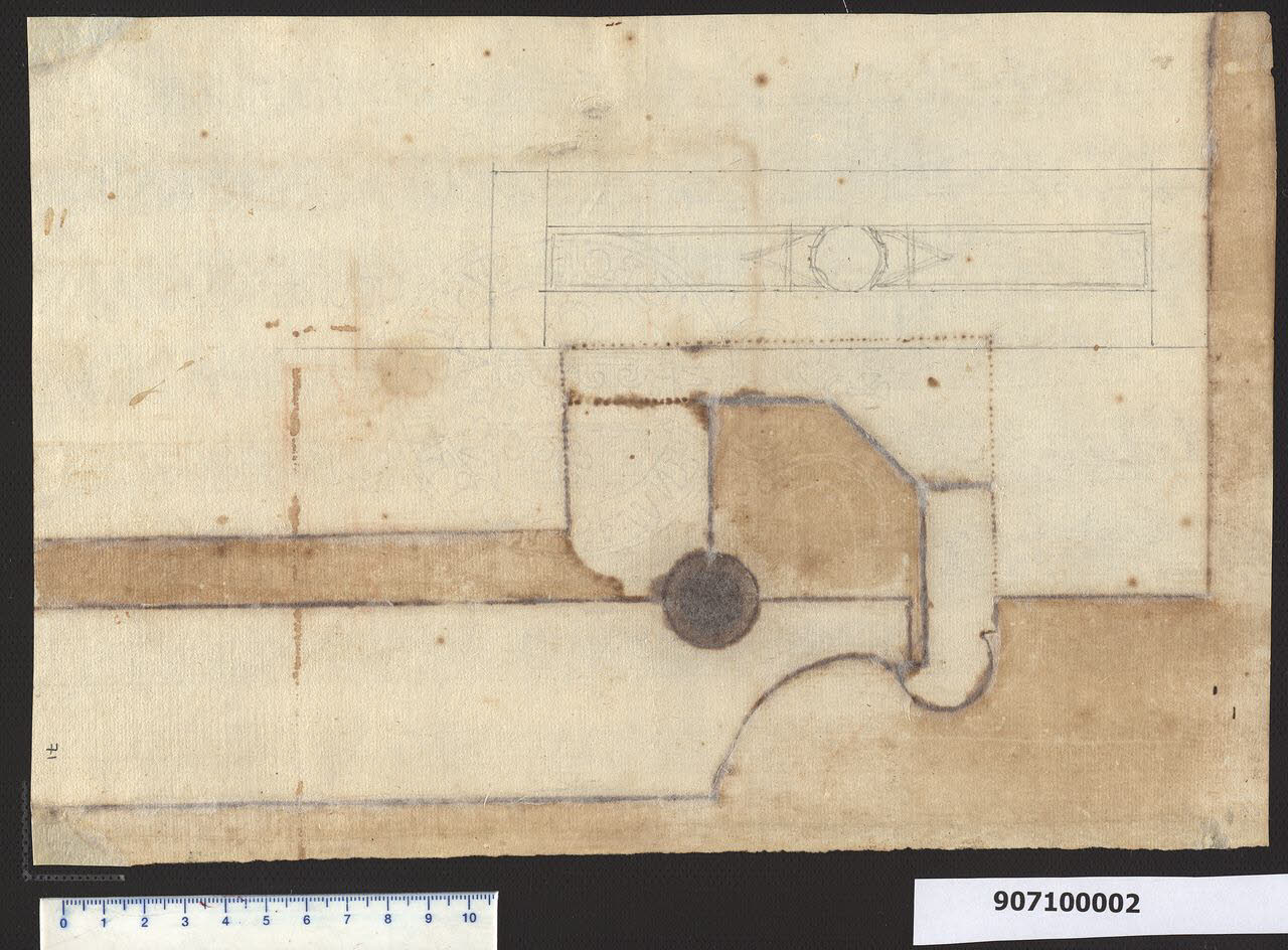 disegno eseguito con grafite, a tiralinee e compasso e parte a mano libera; è tracciato su carta leggera da cui traspare il disegno tracciato sul recto