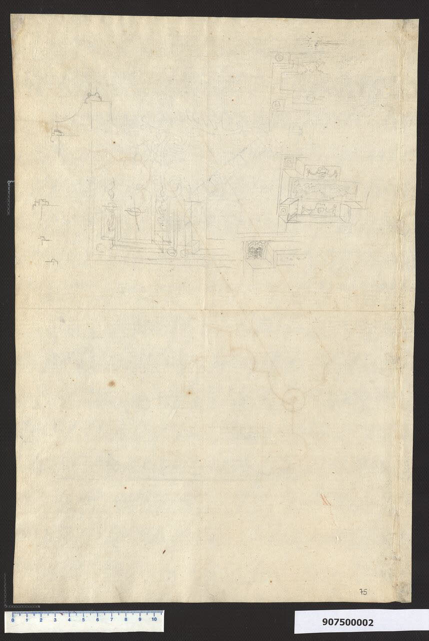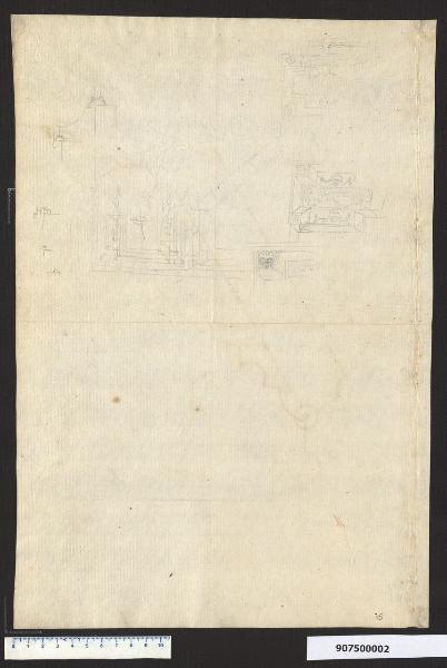 - NOTIZIE STORICO CRITICHE Oltre a piccoli schizzi relativi dettagli di nodi con cerniere, su questo verso si trova rappresentata una decorazione che appare ripresa in prospettiva dal basso, di un soffitto. In essa si individua una riquadratura centrale decorata, ma il cui soggetto è indistinto (forse un paesaggio) e due pannelli contrapposti raffiguranti due volti con festoni laterali.