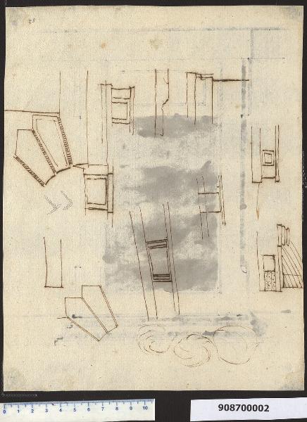 - NOTIZIE STORICO CRITICHE Nel progetto di ristrutturazione della villa Sardini a Pieve Santo Stefano che prese corpo tra il 1773 e il 1775 (prospetto di Carlo Bianconi in Milano, Collezione Sardini Martinelli inv. 9,54 pubblicato in Dallaj, 2005, p. 42) erano state progettate finestre nel basamento per rischiarare il piano seminterrato. Queste non furono realizzate nella costruzione definitiva e i sotterranei vennero illuminati attraverso le sole aperture dei prospetti laterali, come si desume dall'iconografia storica dell'edificio (Sabatini, p. 60). Negli schizzi del disegno in esame Sardini è autonomamente alla ricerca dell'impaginazione delle cornici di tali finestre, oscillando tra la soluzione quadrangolare e quella a semicerchio con rivestimento a bugnato. Dell'indecisione danno testimonianza anche gli studi di prospetto antecedenti al disegno inv. 9,54 (Milano, Collezione Sardini Martinelli inv. 9,50; 9,47; 9,79; 9,126). Dai carteggi scambiati tra Sardini e Bianconi veniamo a sapere che il committente doveva adattare le cornici alla lunghezza delle pietre che aveva a disposizione (Archivio di Stato di Lucca, Archivio Sardini, cart. 141, lettera 77).
