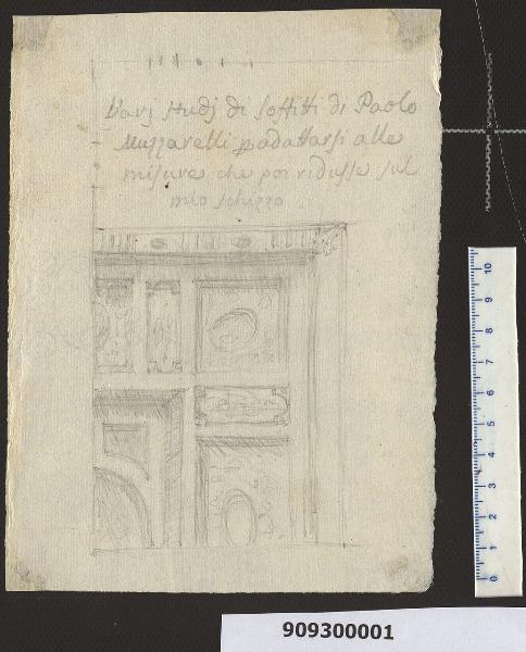 - NOTIZIE STORICO CRITICHE Il marchese Giacomo Sardini aveva messo su carta le proprie idee a proposito della decorazione del soffitto della sala principale della villa a Pieve Santo Stefano (Milano, Collezione Sardini Martinelli inv. 9,92), per la cui ristrutturazione si era largamente avvalso di consigli e disegni inviatigli da Carlo Bianconi (ibidem, 9,54; 9,96; 9,86). Il pittore incaricato dell'esecuzione fu il non meglio noto Paolo Muzzarelli, il quale aveva annunciato in una lettera al marchese, spedita da Bologna il 15 settembre 1778, l'invio dei propri disegni per il soffitto (Archivio di Stato di Lucca, Archivio Sardini=AS, cart. 142, n. 674); il foglio in esame ed altri due conservati dal Sardini sono verosimilmente riconducibili alla circostanza (Milano, Collezione Sardini Martinelli 9,83; 9,95). Il committente era arrivato a Muzzarelli grazie alla segnalazione di un corrispondente che sapeva di un precedente incarico per lavori "a uso Raffaello" eseguiti per il conte Zini (da leggere Gini) (AS, cart. 143, n. 859). Sardini, nelle proprie Memorie, attribuisce erroneamente al pittore la qualifica di "accademico clementino": "Evvi colà una sala che avea io fatto ornare di stucchi a diversi riquadri di bugne con risalti di fasce e di cornici adattandole in questo modo alle pitture di grottesche sul gusto che dicesi di Raffaello. Esse furono concertate ed eseguite negli ornati dal bolognese Muzzarelli accademico clementino cui aggiunsi il nostro Bertani" (AS, n. 128, Memorie ... M. Teresa Sardini, c. 18). Muzzarelli, forse formatosi presso l'accademia bolognese, poteva essere imparentato con l'ornatista Giuseppe Muzzarelli segnalato dalla locale letteratura artistica (A. C. Romagnoli, La storia delle arti del disegno, Bologna 1888, p. 111). Il modello di riferimento della decorazione pittorica che ha guidato le scelte di Sardini viene anche ribadito negli scritti del suo amico Tommaso Trenta: "L'esquisito gusto, e l'eleganza degli ornamenti congiunta ad una sorprendente vivacità di colorito formano il carattere del sig. Muzzaroli; imitatore felicissimo delle non mai abbastanza lodate Volte del Vaticano" (Archivio di Stato di Lucca, Carte Trenta, vol. 16, fasc. 31, c. 336). Il disegno in esame, insieme agli altri due citati studi di Muzzarelli mostrano il tentativo, da parte del pittore, di suggerire una decorazione centrale di sagoma ovale, in parte apparentata con l'idea di Bianconi (Milano, Collezione Sardini Martinelli inv. 9,86), ovale però da affiancare con ulteriori campiture decorative. La formula appare pertanto un po' più ampia di quella prefigurata dal committente nel proprio schema tracciato sul verso del foglio in esame.\nLa villa fu demolita intorno al 1930.