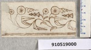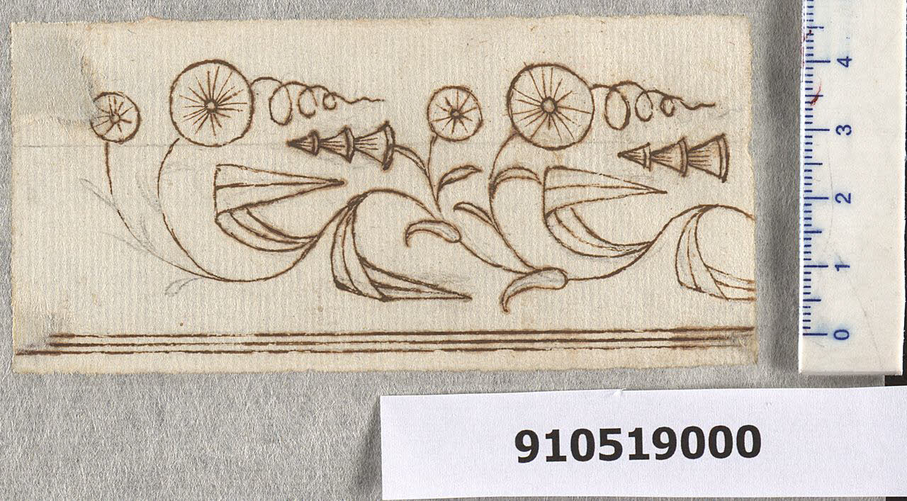 - NOTIZIE STORICO CRITICHE La presente fascia a racemi, ideata da Sardini per le decorazioni destinate agli interni della propria villa a Pieve Santo Stefano, si apparenta ad altri studi il cui motivo portante è ritmato da elementi en chute proiettati ortogonalmente (Milano, Collezione Sardini Martinelli inv. 9, 105/1d; 9,110e; 9,115c e Archivio di Stato di Lucca, Archivio Sardini, cart. 103).