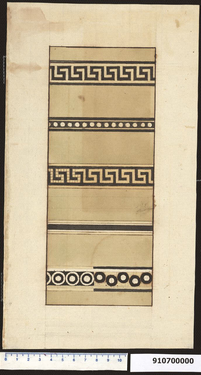 - NOTIZIE STORICO CRITICHE Il presente studio di fasce con greche, grani e cerchi concentrici si apparenta, nella ricerca di motivi di ornato geometrizzante, con altri disegni di Giacomo Sardini (Milano, Collezione Sardini Martinelli inv. 9,105/1c; 9,105/1e; 9,115v). Sardini si era dedicato per qualche tempo al rilancio di una manifattura di vasellame a Monte San Quirico (E. Amico Moneti, Giacomo Sardini patrizio lucchese, erudito e bibliografo, 1956, p. 60) e forse tali studi possono avere a che fare con quell'attività.