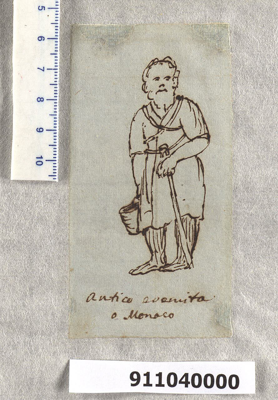 - NOTIZIE STORICO CRITICHE Il disegno è ascrivibile al marchese Sardini per ragioni stilistiche. Nella didascalia apposta in calce alla figura si riconosce la grafia del nobile lucchese. Appassionato studioso di libri antichi, durante le sue visite a biblioteche e archivi Sardini non tralasciava di copiare e talvolta di trarre lucidi dalle illustrazioni che destavano la sua attenzione, come ad esempio nel caso delle miniature delle Croniche di Sercambi (Milano, Collezione Sardini Martinelli inv. 3,47 e 3,47bis). Nel caso del disegno in esame non è stato ancora identificato il volume dal quale l'immagine è stata tratta.
