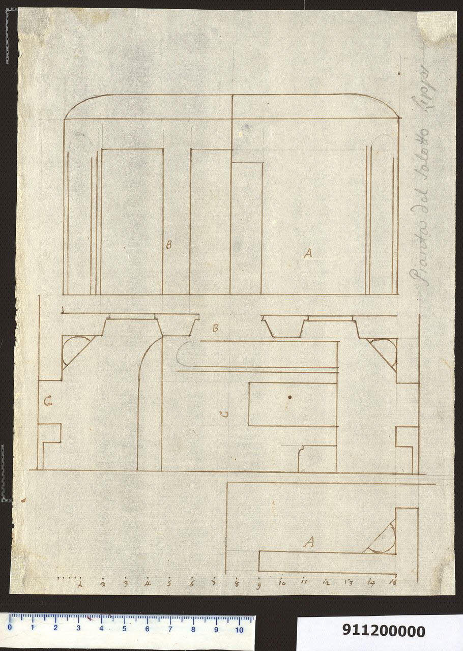 - NOTIZIE STORICO CRITICHE Come risulta dagli scambi epistolari tra il marchese Sardini e Carlo Bianconi (Archivio di Stato di Lucca, Archivio Sardini, cart. 141, n. 88) il capomastro Lippi incontrò a Bologna l'architetto al fine di mettere a punto i dettagli esecutivi per la ristrutturazione della villa Sardini a Pieve Santo Stefano. Nel foglio in esame Lippi ha interpretato e schematizzato il disegno di presentazione inviato da Bianconi con il progetto per gli interni della villa (Milano, Collezione Sardini Martinelli inv. 9,96), al fine di fissare con precisione le partizioni di vuoti e pieni nei muri del salotto. L'assetto definitivo degli interni prese corpo secondo modifiche apportate dal committente e la villa fu demolita intorno al 1930.