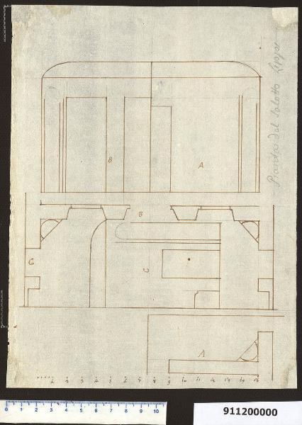 Dettagli di pianta e prospetti del salone al piano nobile nella Villa Sardini a Pieve Santo Stefano. Dettagli di pianta e prospetti del salone al piano nobile nella Villa Sardini a Pieve Santo Stefano