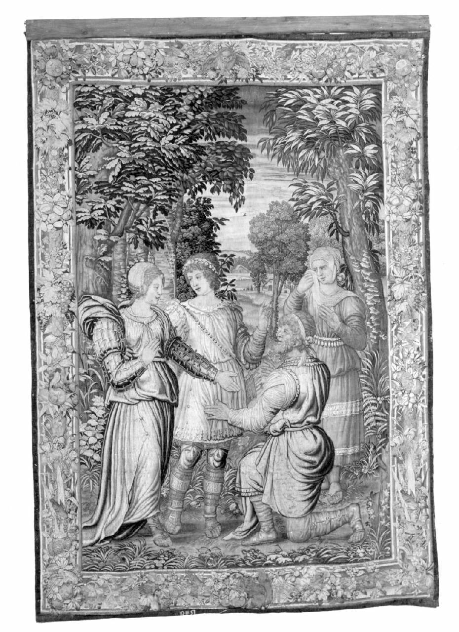 - NOTIZIE STORICO CRITICHE L'arazzo presenta la marca B - scudetto - B resa obbligatoria per decreto imperiale sugli arazzi prodotti a Bruxelles dal 1528.\nLa prima segnalazione dei tre arazzi si riscontra nell'Inventario giudiziale compilato, nel 1829, alla morte del conte Luigi Tadini. A tale data, gli arazzi erano conservati "Nell'antrecamera attigua al cosiddetto appartamento dei forestieri", e sono così individuati al n. 206: "tre quadri od arazzi rappresentanti varie storie con cornice di legno semplice". All'inizio del secolo gli arazzi furono trasferiti in Galleria (forse ad opera di G. Frizzoni), dove sono già esposti nella sala V (attuale sala XXII; Frizzoni 1903) e successivamente trasferiti nella nella Sala G (E. Scalzi 1929). \nNon sono individuabili infatti nel successivo inventario di Palazzo Tadini (Inventario Stabilimento Tadini, ms, XIX secolo, ultimo quarto) che registra la distribuzione degli arredi prima dello smembramento avvenuto con l'asta del maggio-giugno 1919. \nG. A. Scalzi (1969 e 1992) li registra nella Sala VIII, collocazione che coincide con l'attuale.\nIl riferimento ad un montaggio rigido trova conferma nelle indicazioni riportate dalla guida di E. Scalzi (1929) che attesta la presenza di cornici in legno, rimosse perché tarlate. Non è chiaro se l'intervento, dato per compiuto in quell'anno, venga necessariamente a coincidere con il restauro cui furono soggetti tra il 1915 ed il 1918, eseguito ad opera della restauratrice Cornelia Mariani di Milano. In quell'occasione infatti almeno i due arazzi maggiori (D 2 e D 3) ebbero il bordo integrato in blu. L'arazzo D 1, probabilmente il migliore del gruppo, fu restaurato a spese della Regia Soprintendenza (grazie all'intervento del soprintendente Modigliani).\nDal punto di vista iconografico, l'arazzo era pubblicato nel 1903 come "Il figlio di Giacobbe condotto dall'Angelo alla Sposa"; la corretta lettura del soggetto era ristabilita da don Romolo Putelli (1926 e 1929) grazie all'individuazione dell'iscrizione "Paris" "Alex" (ma ancora nel 1929 E. Scalzi avalla la lettura precedente), in seguito mai più messa in discussione.\nMarco Albertario
