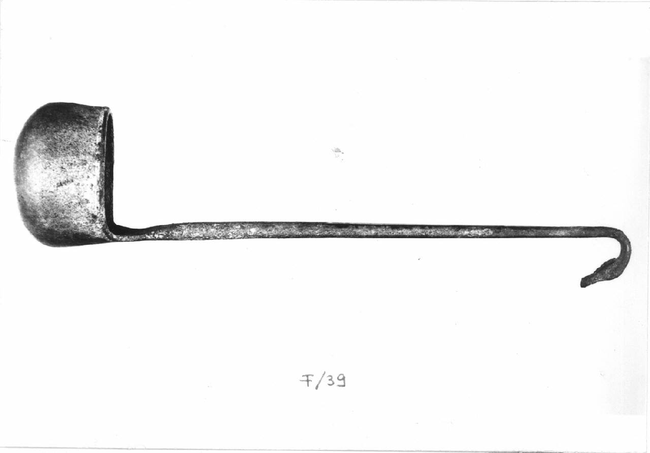 Mestolo di bronzo, liscio: coppa profonda, circolare; manico verticale, a sezione circolare, terminante a testa di palmipede