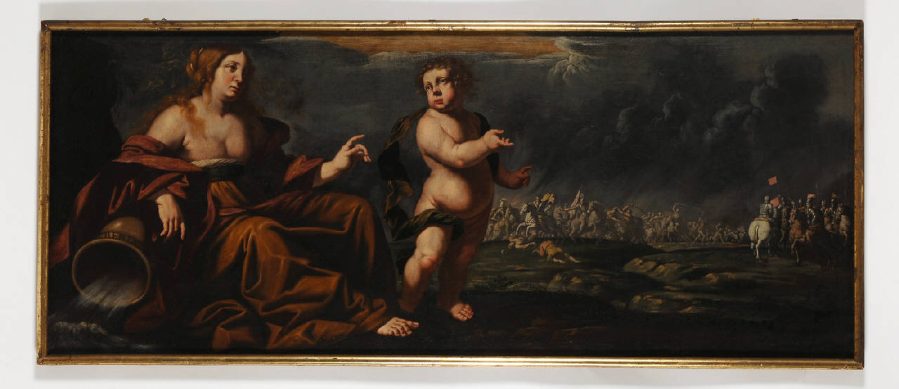 Dipinto inserito entro una cornice in legno modanato e dorato, raffigurante l'allegoria del fiume Trebbia. Lo sfondo è popolato da soldati a cavallo; il cielo è minaccioso, rischiarato da uno squarcio luminoso in alto al centro. A sinistra incombe la figura femminile, che occupa in altezza l'intera superficie pittorica messa a disposizione; poggia il braccio destro sopra un'anfora da cui fuoriesce dell'acqua, che simboleggia il fiume Trebbia. Vicino un bimbo, dalle forme anatomiche molto pronunciate. La luce proveniente da sinistra mette in evidenza la rotondità e la morbidezza delle carni; contrasti tra tonalità calde e tonalità fredde.