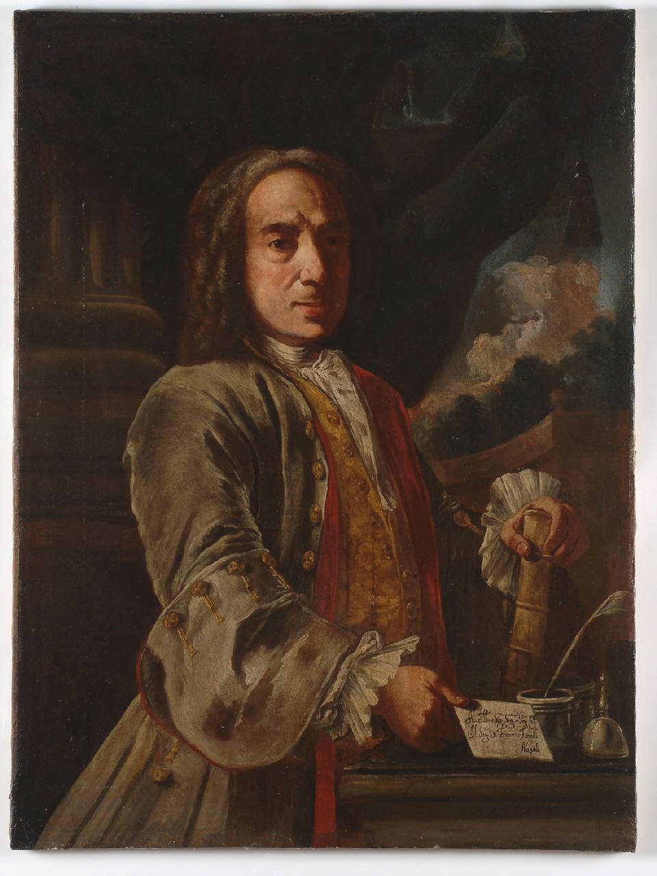 Dipinto privo di cornice raffigurante un ritratto di nobile gentiluomo. Dal fondo scuro da cui si scorge a fatica un tendaggio, al di là del quale si intravede un cielo minaccioso, e a sinistra una colonna scanalata poggiante su un alto basamento, emerge la figura maschile, contraddistinta da un forte realismo nella definizione della fisionomia del volto. La luce proviene da sinistra, creando effetti chiaroscurali morbidi e sottolineando ancor più la ricerca psicologica del personaggio, data da naturalezza; contrasti tra tonalità calde e tonalità fredde per la gamma cromatica utilizzata. La preziosità delle vesti e la freddezza dei metalli è suggerita sempre da una luce indagatrice che evidenzia il realismo della raffigurazione.
