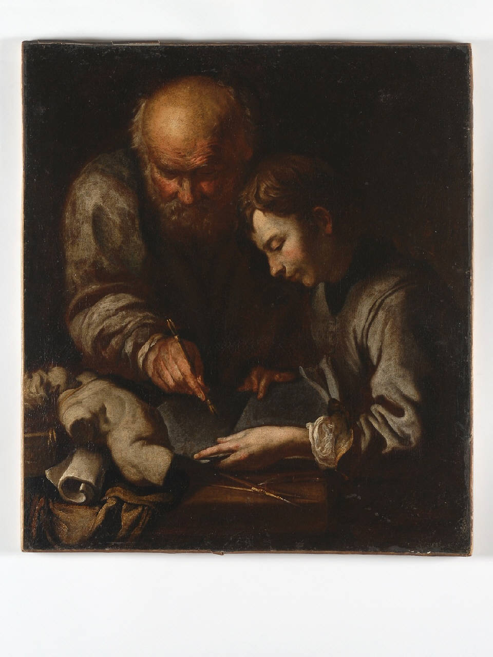 Dipinto privo di cornice raffigurante un anziano che insegna a un bambino a scrivere. Dal fondo scuro, privo di ogni elemento che potrebbe distogliere l'attenzione dell'osservatore dal soggetto raffigurato, emergono le figure maschili, rappresentate in diverse posizioni, contraddistinte da un forte realismo nella definizione della fisionomia del volto: gli influssi di Caravaggio sono ancora evidenti. La luce proviene da sinistra, creando effetti chiaroscurali morbidi e sottolineando ancor più la ricerca psicologica dei personaggi, data da grande umanità e naturalezza; predomina una tonalità calda per la gamma cromatica utilizzata.
