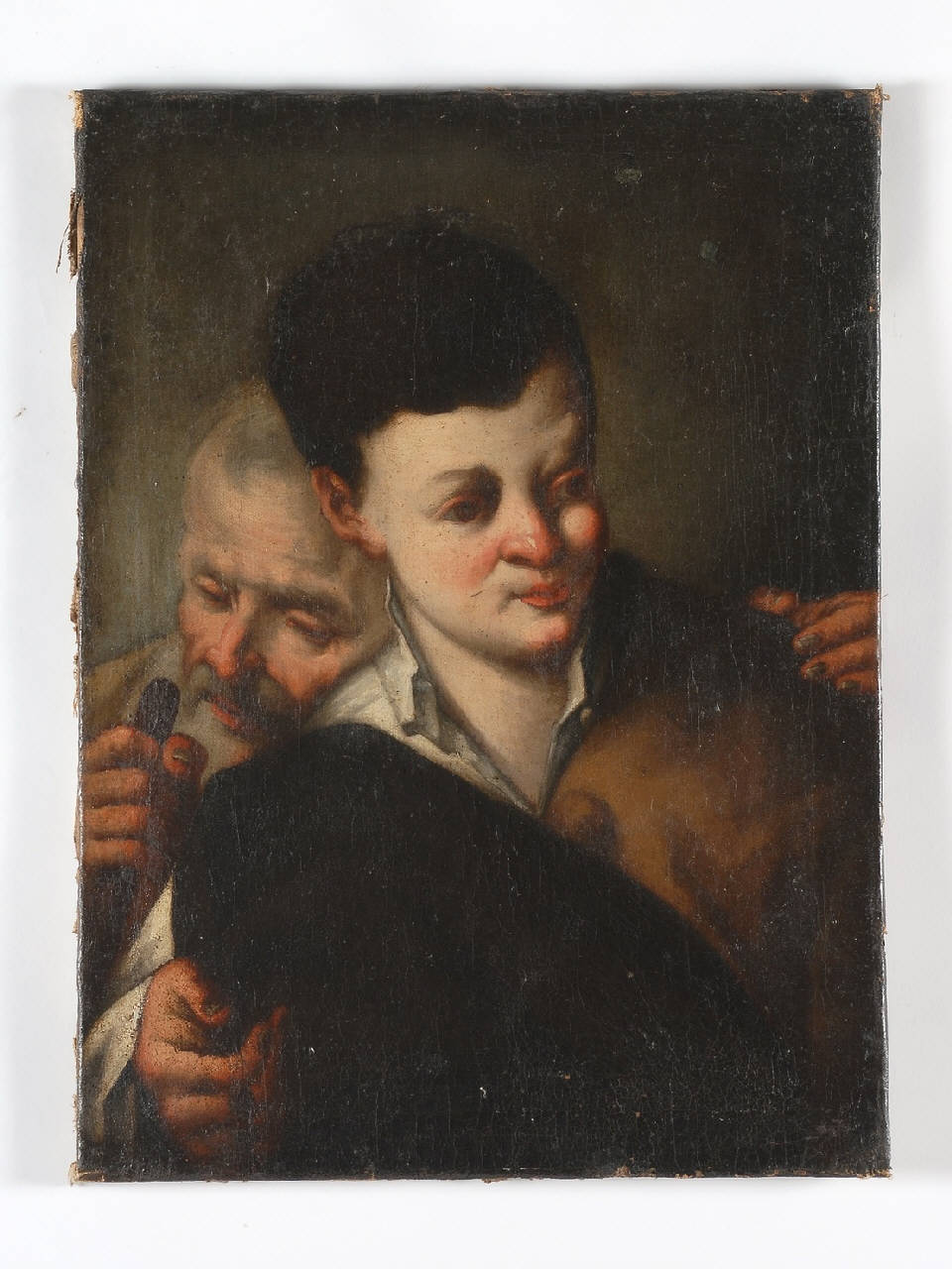 Dipinto privo di cornice raffigurante un anziano con bambino. Dal fondo scuro, privo di ogni elemento che potrebbe distogliere l'attenzione dell'osservatore dal soggetto raffigurato, emergono le figure maschili, rappresentate in diverse posizioni, contraddistinte da un forte realismo nella definizione della fisionomia del volto: gli influssi di Caravaggio sono ancora evidenti. La luce proviene da sinistra, creando effetti chiaroscurali morbidi e sottolineando ancor più la ricerca psicologica dei personaggi, data da grande umanità e naturalezza; predomina una tonalità calda per la gamma cromatica utilizzata.