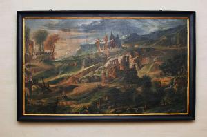 Dipinto di grandi dimensioni inserito entro una semplice cornice in legno verniciato con profilo dorato. Raffigura un paesaggio di fantasia con monti, declivi rocciosi, ruderi di costruzioni e figure umane. La luce proviene dall'alto dando origine a effetti chiaroscurali; contrasti tra tonalità calde e tonalità fredde.