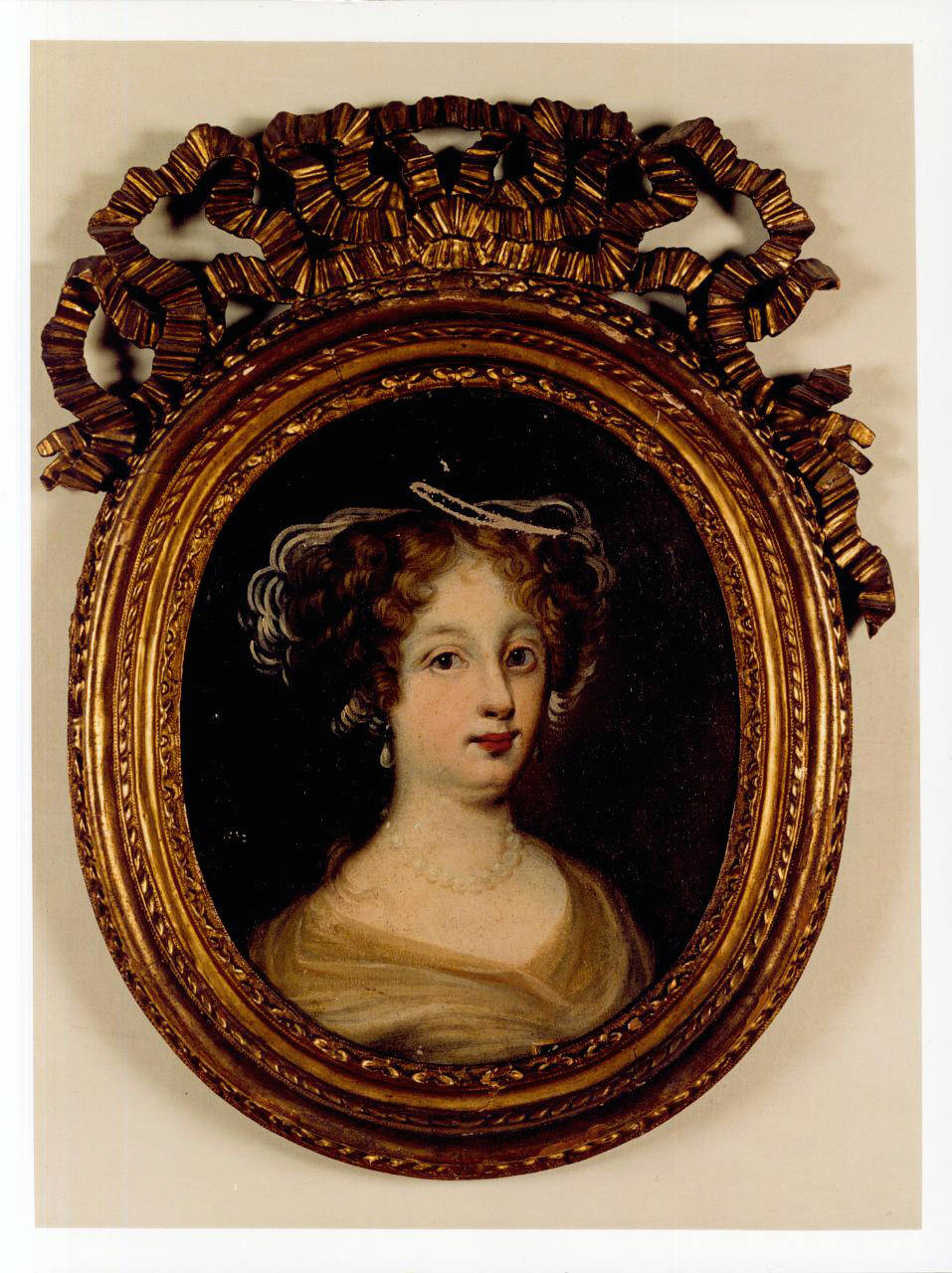 Dipinto di forma ovale inserito all'interno di una ricca cornice in legno dorato e intagliato con motivi decorativi geometrici, modulari e stilizzati; nella parte superiore, elegante e raffinato cartiglio in legno dorato e intagliato. Raffigura il ritratto di una dama dell'epoca, con elegante acconciatura dei capelli e raffinatezza delle vesti. Dal fondo scuro, privo di ogni elemento che potrebbe distogliere l'attenzione dell'osservatore dal personaggio raffigurato, emerge il ritratto femminile, leggermente di tre quarti. La luce proveniente da destra mette in risalto i tratti fisionomici del volto. Si notano i passaggi graduali di chiaroscuro e la ricerca interiore e psicologica del personaggio che occupa quasi per intero la superficie pittorica messa a disposizione.