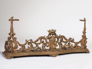 paracamino dalla base ad andamento curvilineo poggiante su tre piedini con motivo a ricciolo. Ricco fastigio con decorazione in ottone cesellato: motivi decorativi vegetali e floreali con al centro stemma nobiliare sormontato da corona a otto punte.