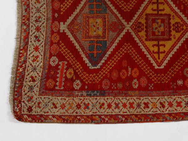 Tappeto orientale a fondo rosso con motivi decorativi geometrici i quali non sono disposti secondo una perfetta simmetria. L'ordito è costituito dai fili verticali; la trama, che dà compattezza al tappeto, dai fili orizzontali; gamma particolarmente vivace di colori.