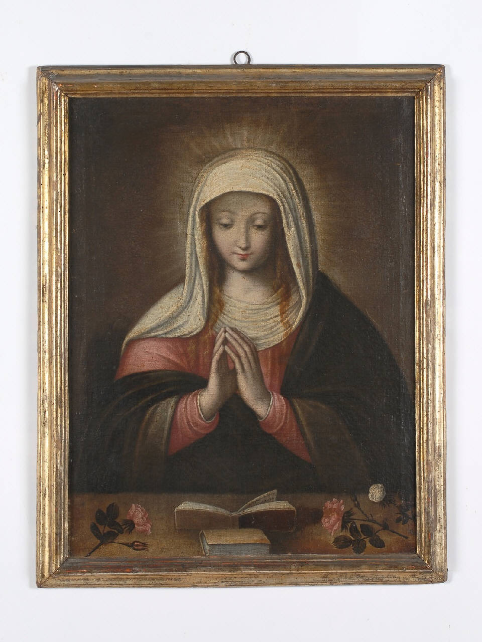 Dipinto inserito all'interno di una semplice cornice in legno dorato, raffigurante la Madonna orante. Dal fondo scuro, privo di ogni elemento che potrebbe distogliere l'attenzione dell'osservatore dal soggetto rappresentato, emerge al centro la figura della Vergine, con le mani giunte, lo sguardo abbassato, intenta a leggere un libro aperto poggiante a un libro chiuso, il tutto posato su un piano di appoggio posto in primissimo piano. La luce proveniente da diverse fonti luminose, si diffonde in modo uniforme all'interno del dipinto, creando passaggi graduali di chiaroscuro che sottolineano la morbidezza degli incarnati. Il dipinto ha un carattere prettamente devozionale e privato, sottolineato ancor più dalla ricerca espressiva e interiore del soggetto raffigurato.
