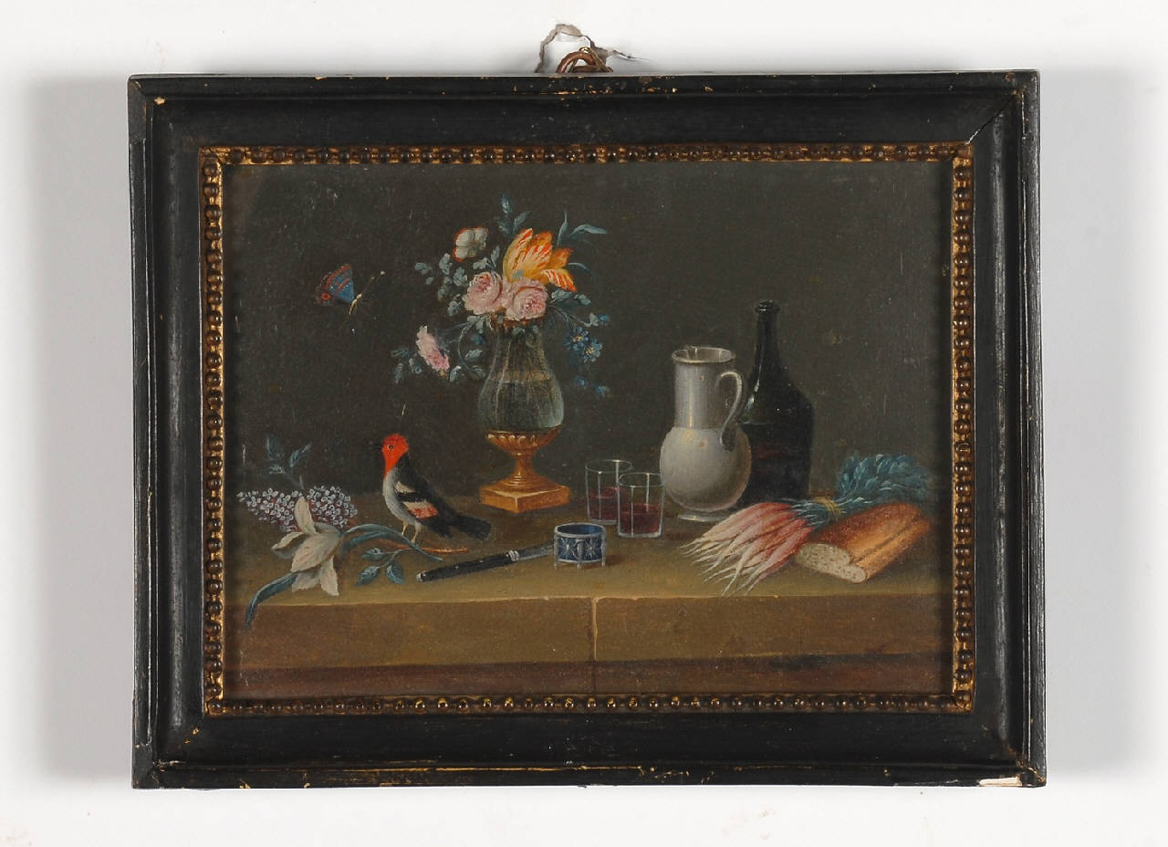 Dipinto inserito all'interno di una cornice in legno verniciato e dorato con motivo decorativo geometrico e modulare, raffigurante una natura morta con fiori e oggetti. Dal fondo scuro emergono in primo piano, un vaso in vetro e metallo dorato colmo di fiori di varia tipologia, altri oggetti di diversa natura, alimenti e un uccellino, il tutto posto su un piano d'appoggio dato da un semplice parapetto. La luce, proveniente da sinistra, crea contrasti chiaroscurali, sottolineando la naturalezza del soggetto rappresentato, la verità nella resa dei materiali, ad esempio la trasparenza del vetro e la freddezza dei metalli.