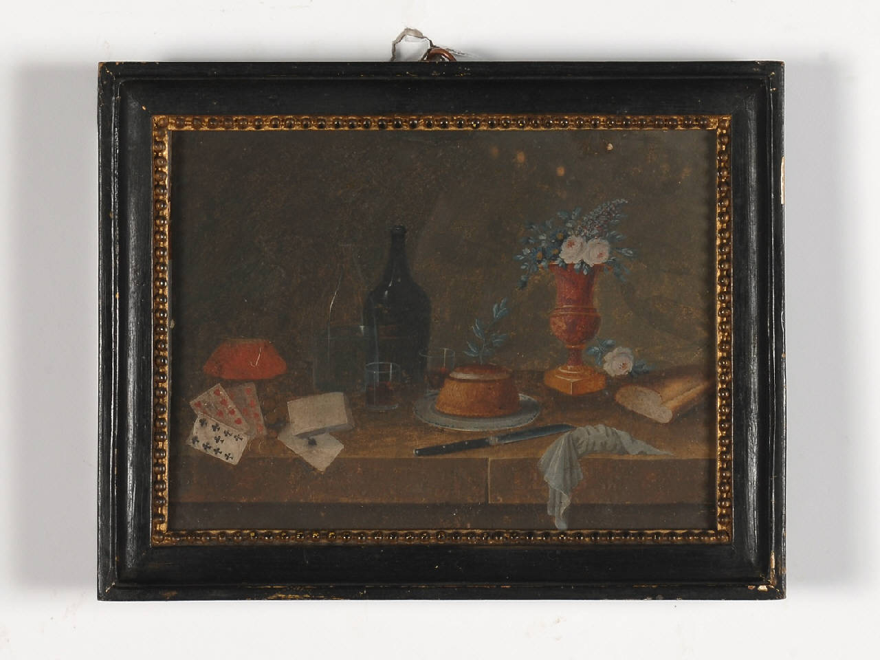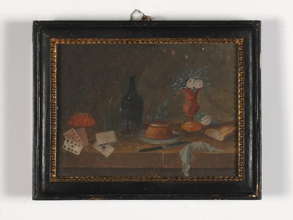 Dipinto inserito all'interno di una cornice in legno verniciato e dorato con motivo decorativo geometrico e modulare, raffigurante una natura morta con fiori e oggetti. Dal fondo scuro emergono in primo piano, un vaso a coppa colmo di candidi fiori, altri oggetti di diversa natura e alimenti, il tutto posto su un piano d'appoggio dato da un semplice parapetto. La luce, diffondendosi in primo piano, crea contrasti chiaroscurali, sottolineando la naturalezza del soggetto rappresentato, la verità nella resa dei materiali, ad esempio la trasparenza del vetro e la freddezza del metallo.