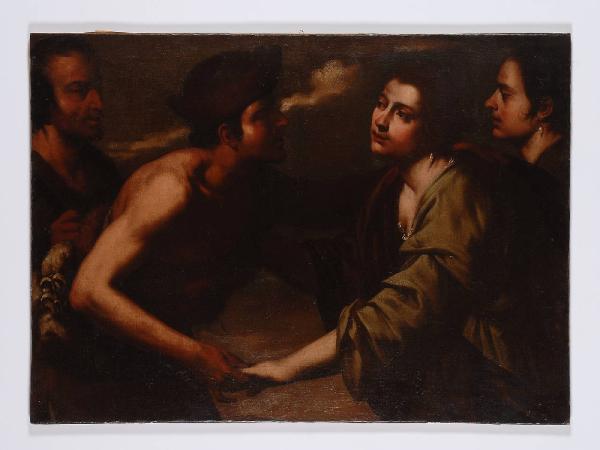 Dipinto privo di cornice, raffigurante in primissimo piano una scena di incontro tra personaggi popolari. Dallo sfondo in cui si intravedono delle nubi in cielo, emergono due figure maschili a sinistra e due figure femminili a destra in atteggiamento di incontro fraterno. Predomina una tonalità calda per la gamma cromatica; la luce proveniente da sinistra crea effetti chiaroscurali graduali, sottolineando la morbidezza del modellato delle carni. Risalta l'intesa psicologica e umana tra i vari soggetti raffigurati.
