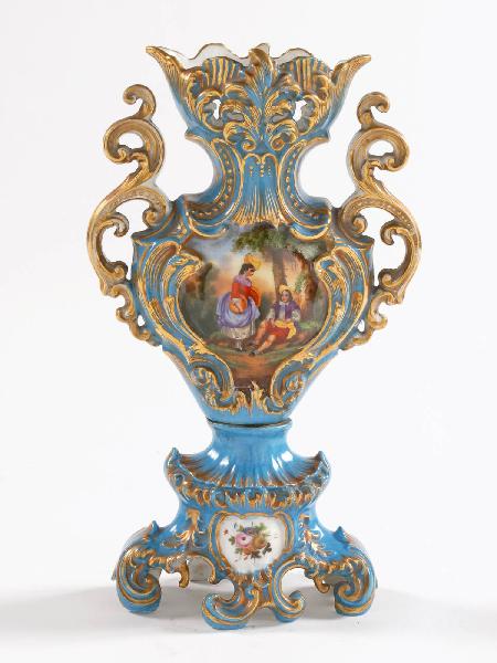 Coppia di vasi a fondo azzurro con raffigurazioni di scene galanti e motivi floreali.