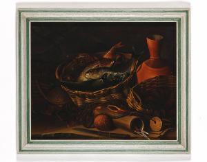 Dipinto inserito in una semplice cornice di legno verniciato, di moderna fattura, raffigurante una natura morta con pesci e strumenti per la pesca. Dal fondo scuro emergono in primo piano i cestini con diversi tipi di pesci e i vari oggetti usati per la pesca. La luce proveniente da sinistra mette in evidenza i vari materiali, la consistenza dei vari elementi della composizione, sottolineando ancor più il realismo, la verità del soggetto rappresentato. Predominano tonalità calde di colore; contrasti chiaroscurali di luce e ombra.