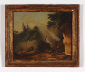 Dipinto inserito in una cornice di legno dorato arricchita da motivi decorativi modulari stilizzati, raffigurante un paesaggio montano. Nello sfondo compaiono declivi rocciosi coperti in parte da vegetazione; il fumo proveniente dalla fucina tende a uniformarsi con le nubi e la limpidezza del cielo soprastante. In primo piano sono presenti figure dell'ambiente popolare che animano il paesaggio; sono definite da tocchi veloci di colore steso a macchie e dalla luce che proviene da più parti. Contrasti tra tonalità calde e tonalità fredde di colore presenti in diverse gradazioni.
