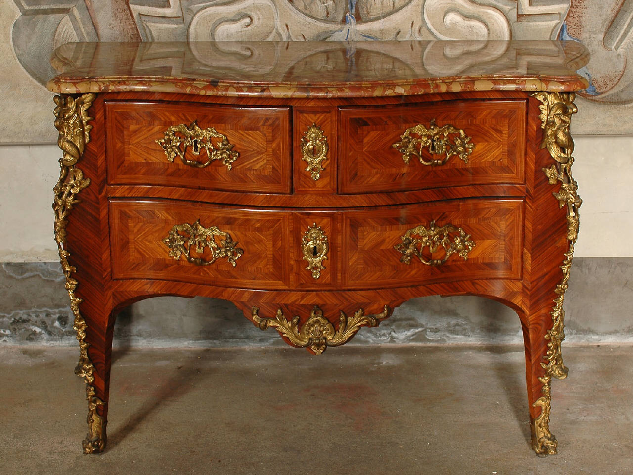 Cassettone impiallacciato in palissandro arricchito da applicazioni in bronzo dorato. Fronte leggermente mosso con due cassetti nella fascia superiore separati da una traversa dal cassetto più ampio della parte inferiore; i cassetti sono ornati da pannelli a spina di pesce entro riquadri filettati. Piano in marmo con ciglio modanato e gambe mosse con sabot in bronzo dorato.