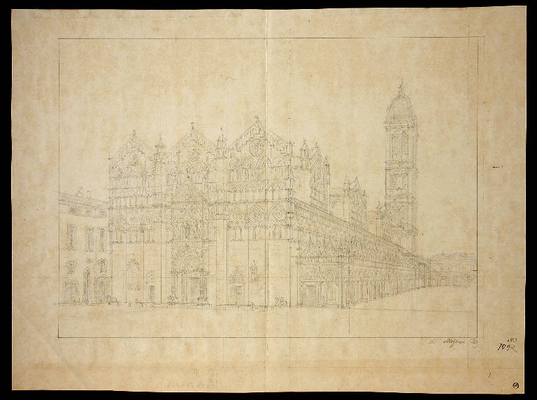 Progetto di restauro della cattedrale di Ferrara, a matita su carta bianca spessa. Riquadrato a matita.