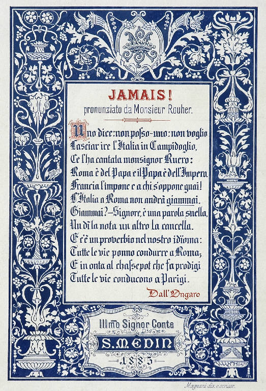 - NOTIZIE STORICO CRITICHE Una foto del disegno, non datata, è conservata nell'album D. 6. Accanto all'immagine, Riccardo Lampugnani ha scritto un appunto a matita: "curioso disegno (tutto è fatto a mano) del 1885, l'epoca dei Chassepot!". Il componimento racchiuso nella cornice è uno stornello di Francesco Dall'Ongaro (1808 - 1873), poeta e patriota, protagonista non secondario del Risorgimento italiano. Dall'Ongaro scrisse "Giammai" a Parigi nel 1867, dove si era recato per visitare l'Esposizione Universale (si veda F. Dall'Ongaro "L'arte italiana a Parigi nell'Esposizione Universale del 1867. Ricordi", Firenze 1869): il breve e polemico stornello è indirizzato al ministro francese Rouher, che aveva escluso ogni possibilità, per lo stato italiano, di entrare un giorno in possesso di Roma. Pubblicati inizialmente su un foglio di New York, i versi di Francesco Dall'Ongaro furono poi inclusi nella raccolta postuma "Stornelli politici e non politici", edita a Milano nel 1883 presso la Libreria Editrice Robecchi (cfr. p. 122 e p. 273, nota 46 bis). Nulla si sa, invece, del "Magnani" autore, nel 1885, di questo disegno assai finito e certamente preparatorio per un incisione finora non rintracciata; e nulla si sa del conte S. Medin a cui il lavoro è dedicato.
