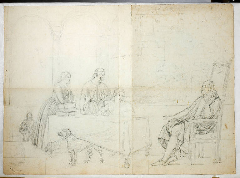 - NOTIZIE STORICO CRITICHE Il foglio, come gli altri di Michele Bisi, è conservato in un album rilegato in pelle, con fregi dorati e la scritta, al centro, "Michele Bisi. Disegni".\nIl disegno è forse un prima idea, poi scartata, per l'acquerello dello stesso tema che Michele Bisi dipinse nel 1834, per commissione di Carlo Alberto re di Sardegna: la destinazione è precisata nella nota che accompagna la descrizione delle opere esposte alla mostra annuale dell'Accademia di Brera (cfr. "Le glorie delle belle arti", Milano, 1834, p. 158). In quegli anni, infatti, Carlo Alberto stava componendo una sua raccolta di acquerelli e disegni, che è tuttora conservata in un album, detto appunto "di Carlo Alberto", formato da circa cento fogli montati su cartoncino (Torino, Biblioteca Reale, Mss. Varia 217): tra gli altri, il "Milton", appunto, di Michele Bisi (cfr. M.C. Gozzoli, scheda n° 355, pp. 371-372, vol. I, in "Cultura figurativa e architettonica negli Stati del Re di Sardegna 1773-1861", catalogo della mostra, Torino 1980; F. Mazzocca "L'ideale classico. Arte in Italia tra Neoclassicismo e Romanticismo", Venezia, 2002, p. 567; una riproduzione dell'acquerello è in M.C. Gozzoli, M. Rosci, G. Sisto "L'opera grafica di Giovanni Migliara", Alessandria 1977).\nIl tema del poeta inglese Milton che, ormai cieco, detta il suo "Paradiso perduto" alle figlie ebbe una discreta fortuna in epoca romantica: è ben nota, ad esempio, la versione che ne diede, tra i primi, Eugène Delacroix, e che l'artista espose al Salon nel febbraio 1828 (cfr. "Eugène Delacroix 1798-1863. Exposition du Centenaire", Parigi 1863, p. 44, cat. 105; ora in collezione privata americana). A Milano, Giovanni Migliara nel 1832 aveva dipinto un "Milton" ad acquerello monocromo, un tempo conservato nella raccolta torinese di Carmen Ferrero (cfr. A. Mensi "Giovanni Migliara 1785-1837", Bergamo, s.d., ma 1937ca, p. 99, cat. 1056): e forse fu proprio Migliara, che di Michele Bisi era buon amico, a suggerire il tema al pittore milanese. \nNel 1842 Michele Bisi dipinse una seconda versione del "Milton", ancora all'acquerello ed esposta, come la prima, alla mostra annuale dell'Accademia di Brera ("Esposizione delle opere degli artisti e dei dilettanti nelle Gallerie dell'I.R. Accademia di Belle Arti per l'anno 1842", Milano 1842, p. 24, n° 176; "Guida critica all'esposizione delle Belle Arti in Brera scritta dal pittore Giuseppe Elena", Milano 1842, p. 25, n° 176): a questa, perduta, potrebbe meglio riferirsi il disegno inv. 4980 che, per dimensioni, è assai diverso dallo studio inv. 4978, certamente in relazione con l'acquerello di Carlo Alberto; la breve descrizione dell'acquerello riportata in una delle guide alla mostra di Brera del 1842, che loda in particolare la figura della figlia "...appoggiata a vari volumi" ("Giudizio d'un amatore sulla esposizione dei lavori di Belle Arti dell'anno 1842", Milano 1842, p. 16), non consente, purtroppo, conclusioni certe: quella figura, infatti, compare, appena variata, in entrambi i disegni e, ancora, nella versione definitiva conservata a Torino.