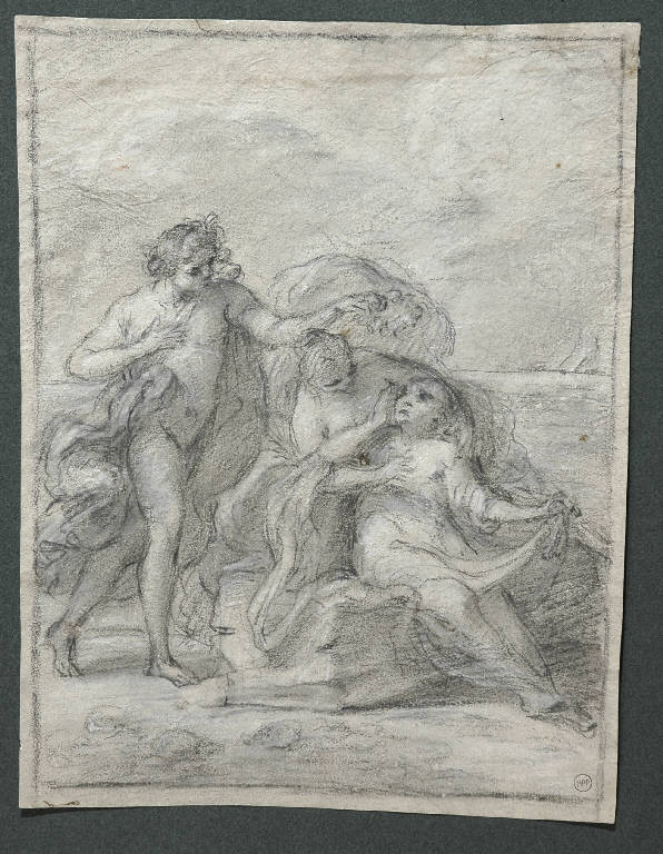- NOTIZIE STORICO CRITICHE Una foto del disegno, non datata, è conservata nell'album Lampugnani D.3. Questa scena con il "Bacco e Arianna sull'isola di Nasso" sembra assai vicina, per tecnica e stile, al foglio con "Mercurio uccide Argo" (inv. 5108), che una scritta antica assegna al pittore friulano Jacopo D'Andrea (Rauscedo, Pordenone 1819 - Venezia 1906): è identico, infatti, il segno veloce, ma un po' greve della matita nera; identico l'uso del gesso bianco, steso a illuminare forme larghe e morbide, ora a tocchi densi, ora a tratti rapidi e nervosi; identico, infine, il modo di marcare, sui volti, brevi tratti orizzontali, o punti, a indicare rapidamente occhi, naso e bocca dei personaggi. I pochi disegni noti del pittore friulano non consentono, tuttavia, di confermare con certezza l'attribuzione.