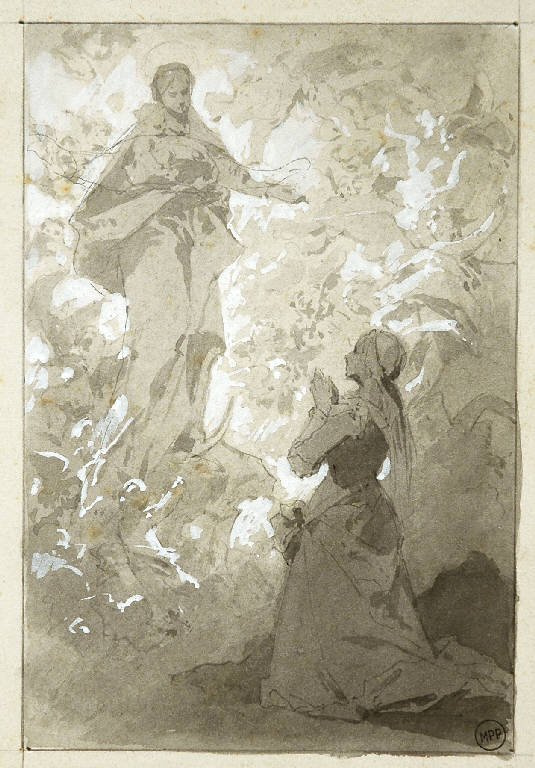 - NOTIZIE STORICO CRITICHE Questa "Apparizione della Madonna a Lourdes" appartiene ad un ampio gruppo di disegni che alcune scritte, poste per lo più sui cartoncini di supporto, attribuiscono genericamente ai "Morgari": il riferimento è alla nota dinastia di pittori piemontesi che lavora intensamente a Torino e nell'intero Piemonte per tutto il XIX secolo e parte del XX. Per ragioni di stile, questo foglio sembra databile agli ultimi anni dell' '800 o ai primi del '900: e potrebbe quindi essere assegnato a Luigi Morgari (Torino 1857 - 1935), figlio di Paolo Emilio, conosciuto soprattutto per la sua vasta produzione di carattere religioso.