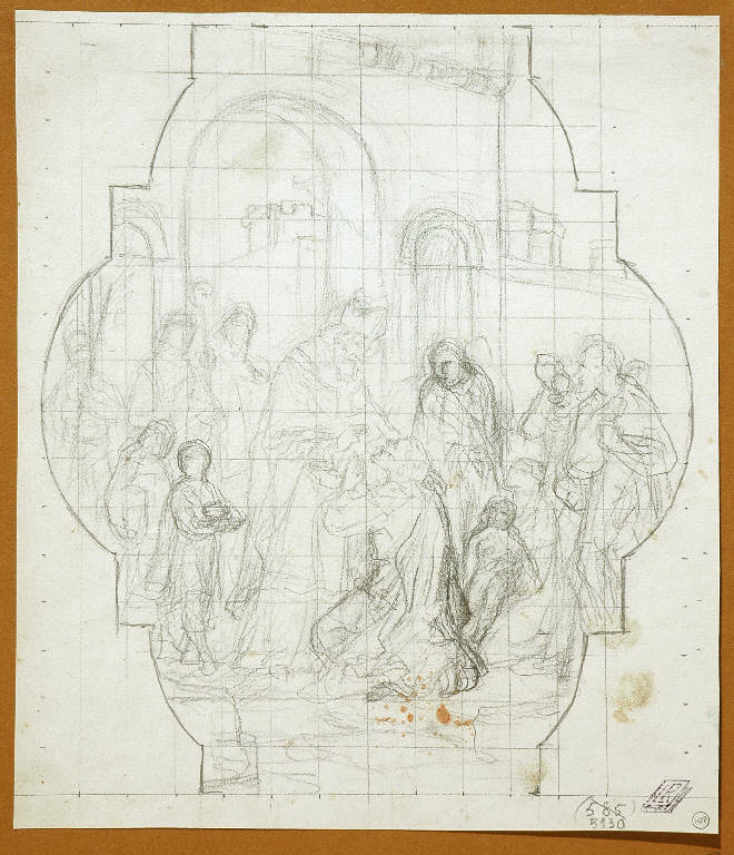 - NOTIZIE STORICO CRITICHE Questo studio di scena sacra, probabilmente preparatorio per un affresco, appartiene ad un ampio gruppo di disegni che alcune scritte, poste per lo più sui cartoncini di supporto, attribuiscono genericamente ai "Morgari": il riferimento è alla nota dinastia di pittori piemontesi che lavora intensamente a Torino e nell'intero Piemonte per tutto il XIX secolo e parte del XX. Per ragioni di stile, questo foglio sembra databile alla metà dell' '800: potrebbe quindi essere assegnato a Paolo Emilio Morgari (Torino 1815 - 1882), figlio di Giuseppe, conosciuto soprattutto per la sua vasta produzione di carattere religioso. Il confronto con una cosa sicura di Paolo Emilio Morgari, il foglio inv. 5229 delle collezione Lampugnani, firmato dall'artista, conferma a mio parere questa ipotesi.