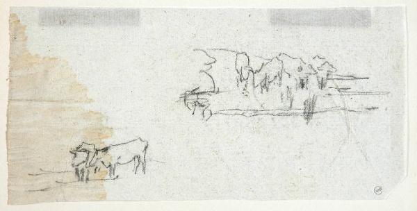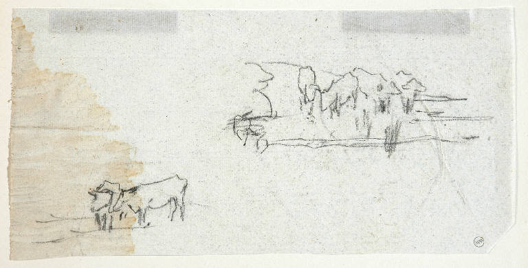 - NOTIZIE STORICO CRITICHE Il disegno fa parte di un insieme, con numeri di inventario da 5008 a 5026, conservati da Riccardo Lampugnani in una cartelletta di cartone con etichetta che reca l'iscrizione a penna "Luigi Bertelli 20 disegni originali" e, sempre a penna: "1852-1916, e altri". I disegni pevenuti al museo Poldi Pezzoli sono 19. Il disegno mancante è documentato da una foto nell'Album "D 15" e rappresenta una piccola figura femminile davanti a un albero. Nello stesso Album è conservata una foto in b/n del presente disegno (recto). La datazione post quem proposta indica il periodo tardo dell'attività di Bertelli, caratterizzato dallo studio dal vero (prediletto dall'artista) del paesaggio reso con un tratto sintetico in una impaginazione di ampio respiro che spesso presenta un punto di vista lontano e rialzato. Il presente disegno riporta due piccoli schizzi di un paesaggio con alberi e, sotto, di due buoi al pascolo.