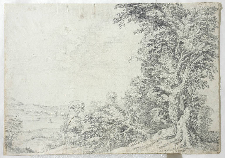 - NOTIZIE STORICO CRITICHE Il disegno è posto in relazione con il n. 4770 di inventario della medesima collezione Lampugnani per le enalogie stilistiche, oltre che per le dimensioni del foglio. Se però il "Viale alberato" appariva costruito in modo tale da poter far pensare ad una scenografia, quello in esame potrebbe anche riferirsi ad un semplice disegno di studio. Permangono comunque le osservazioni evidenziate nel caso del precedente soggetto e quindi la discendenza dai modi bibieneschi. L'apertura dello spazio a sinistra, con il delicato scorcio di cittadina quasi seminascosta tra l'ondulazione collinare, denota comunque una mano di buona levatura, attenta al modulare della luce in profondità.