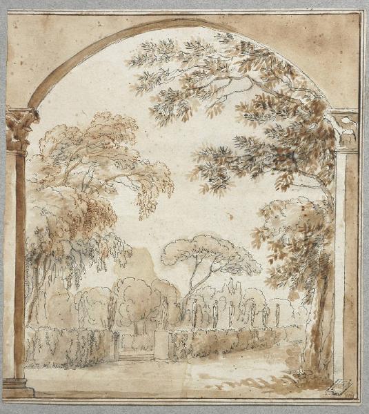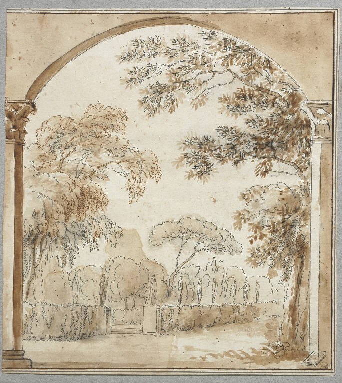 - NOTIZIE STORICO CRITICHE Il disegno che descrive un giardino adorno di statue visto attraverso un arco in muratura definito da paraste corinzie, appare caratterizzato da un tratto sottile e mosso che può forse essere accostato ai modi dello scenografo torinese Luigi Vacca (1778-1854), del quale rivela anche un'analoga maniera di ombreggiare ad acquerello. Si veda in tal senso il confronto con il disegno corrispondente al n. 5166 proveniente dalla medesima collezione Lampugnani e conservato presso il Museo Poldi Pezzoli.