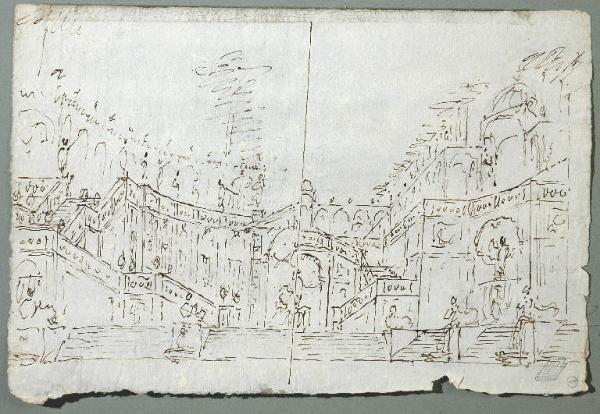 - NOTIZIE STORICO CRITICHE Il disegno presenta i modi consueti della produzione matura di Fabrizio Galliari caratterizzata dal tratto rapido e nervoso, agile e scattante e dalla maniera di lasciare imprecise le forme, come pure dal frammentarsi della scena in terrazzamenti collegati da scalinate che si intersecano, riccamente decorate da statue. Venne visionato da M. Viale Ferrero il 24/10/1969 (cfr. l'iscrizone appuntata dal collezionista Lampugnani sul supporto) che ne confermò l'attribuzione e lo riferì all'incirca al 1785.